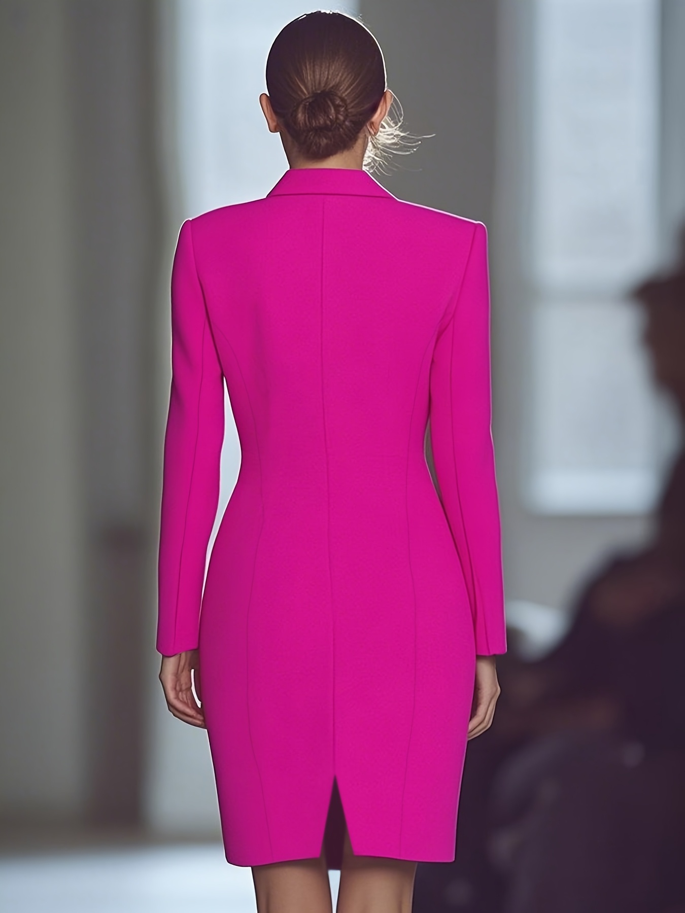 [Bright Pink Blazer Dress] Elegant Bright Pink Long Sleeve Blazer Dress | Women's Mid-Length Office & Casual Style with Double-Breasted Notch Lapel, Polyester Blend, Spring/Summer Collection, Versatile Fashion