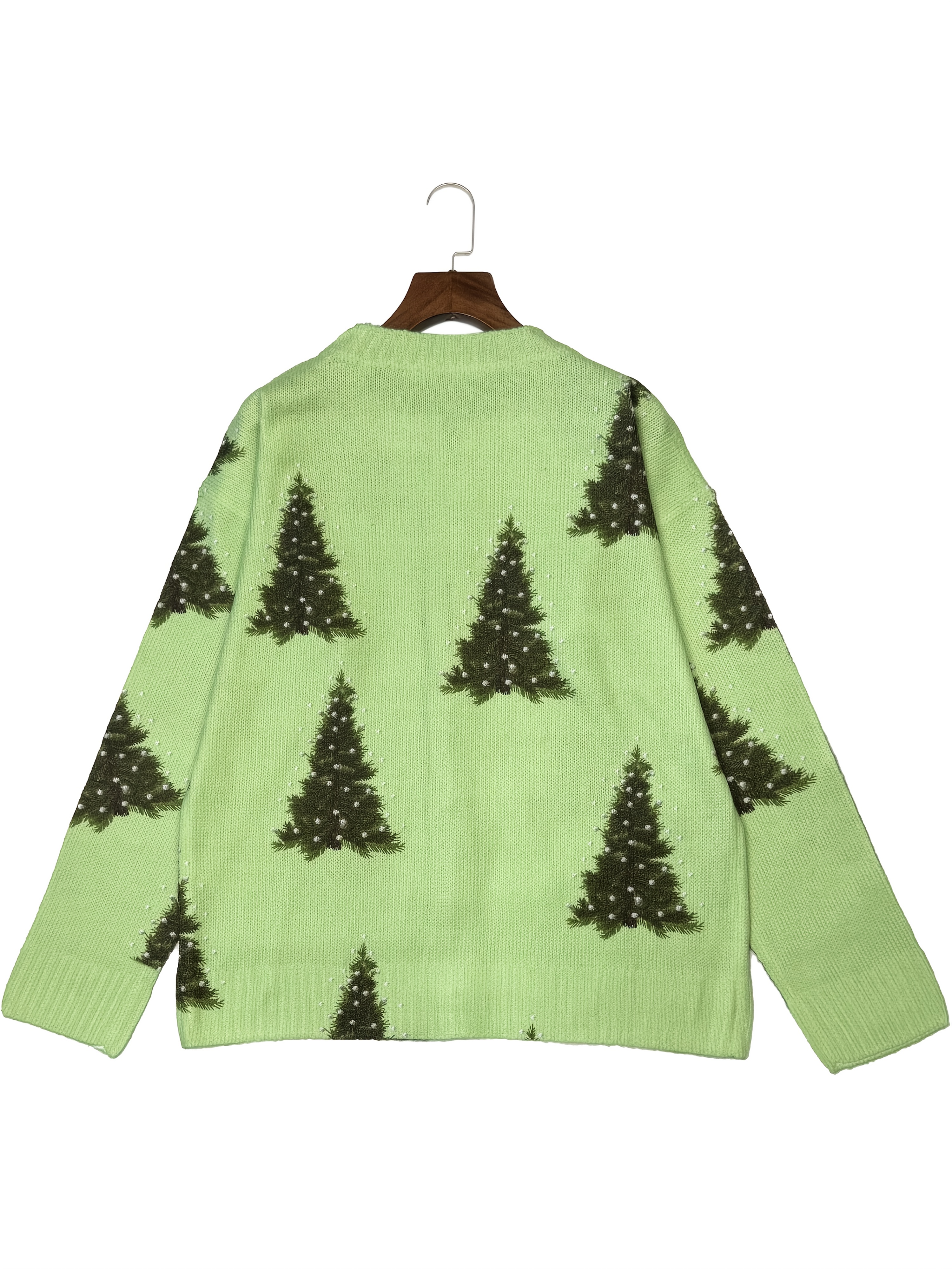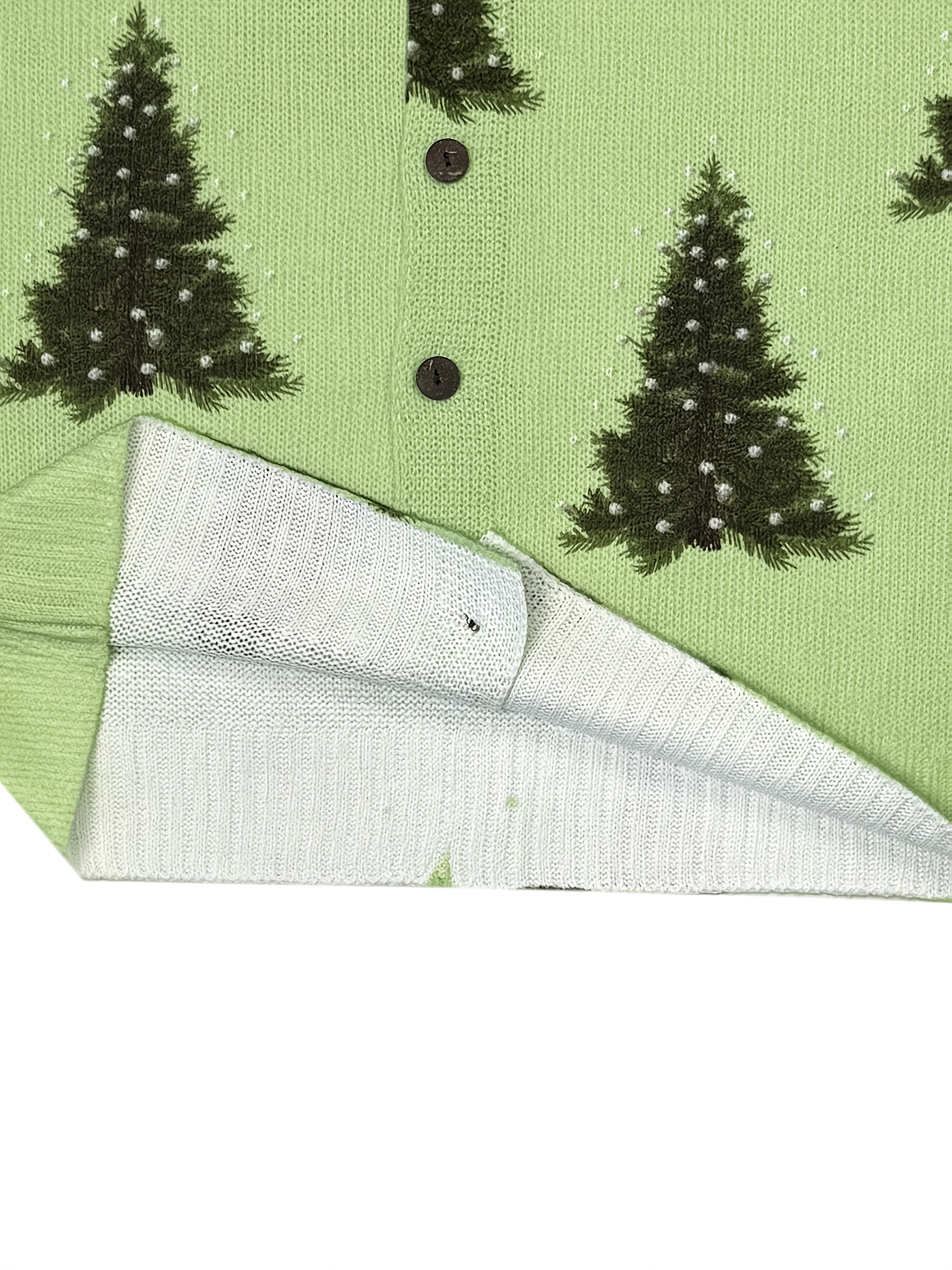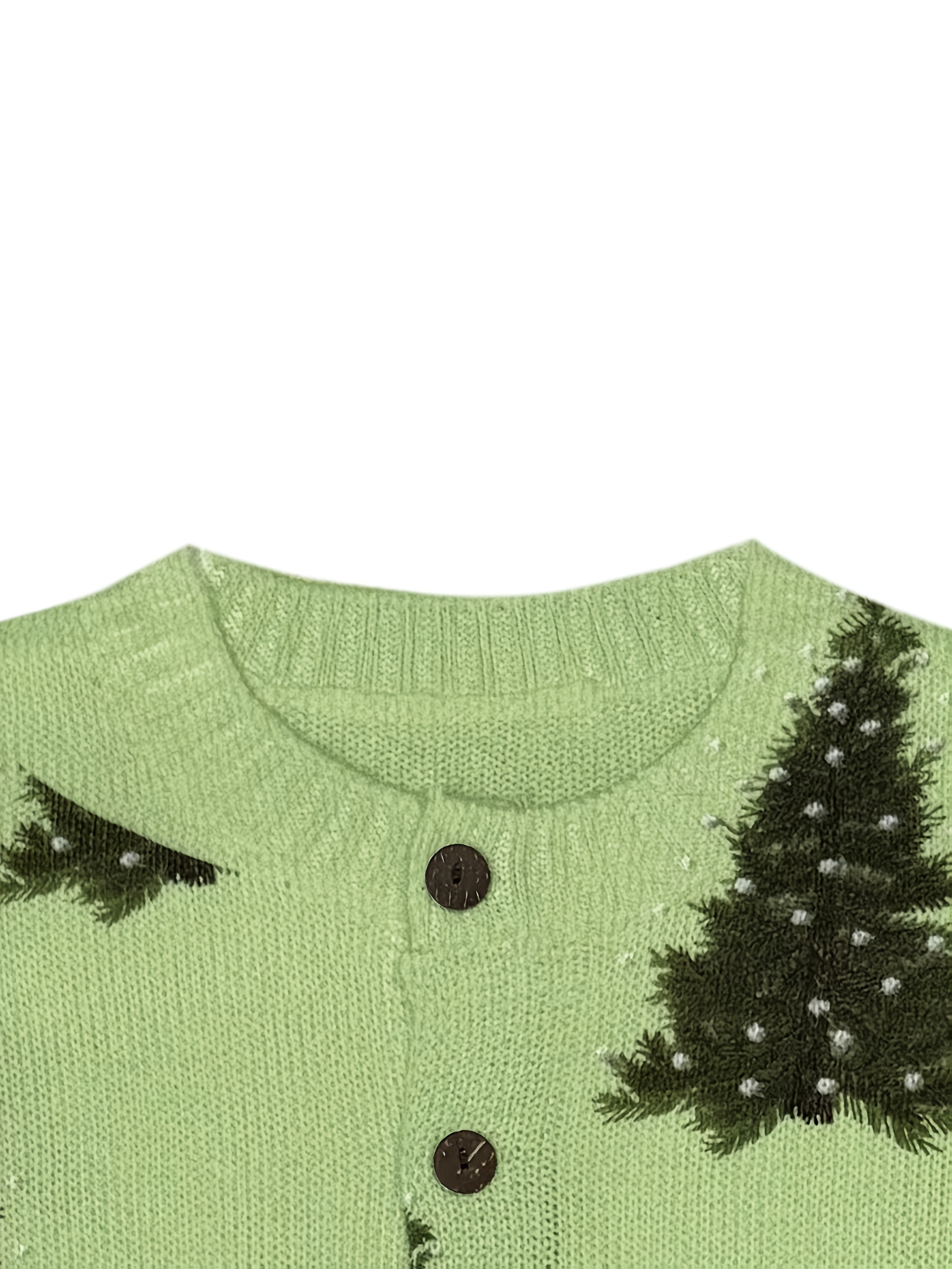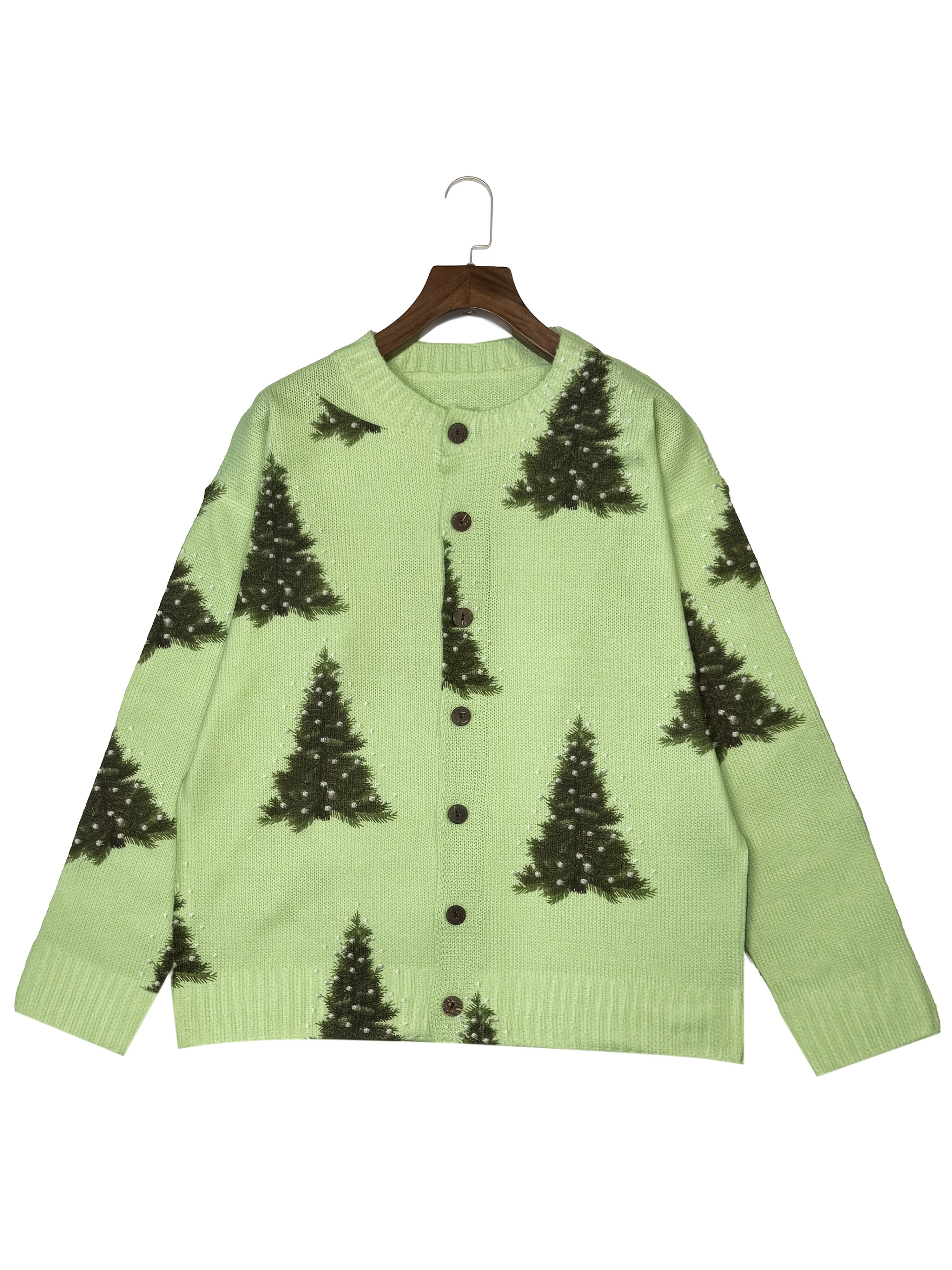 [Christmas Tree Print Cardigan] Women's Elegant 3D Christmas Tree Print Cardigan Sweater - Lime Green with Brown Button Closure, All-Over Festive Pattern, Round Neck & Button Front, Cozy for Holiday Parties & Winter Outfits (Hand Washable)