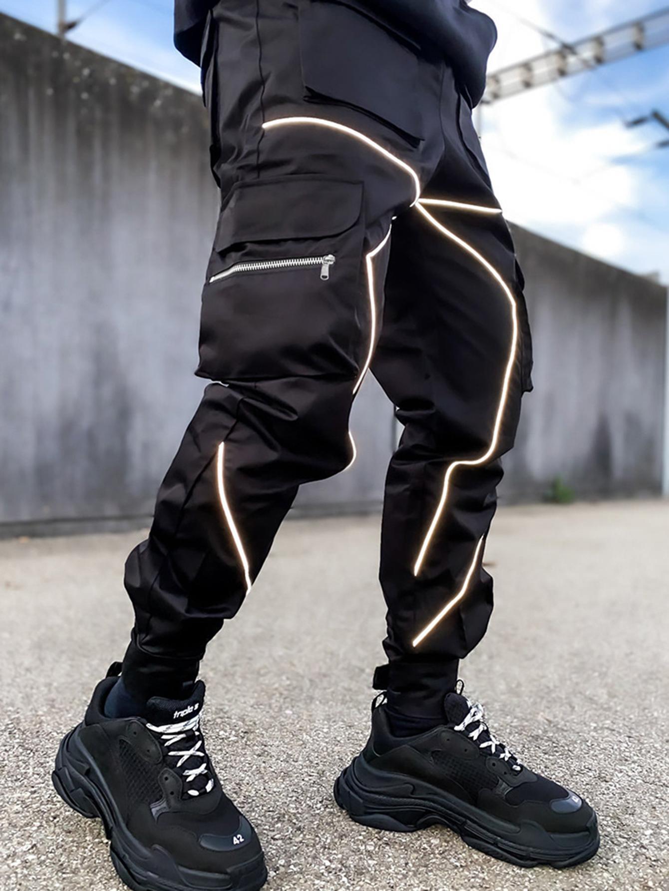 TOOLUCK Men's autumn and winter loose straight casual overalls, multi-pocket cuffs and reflective sports pants