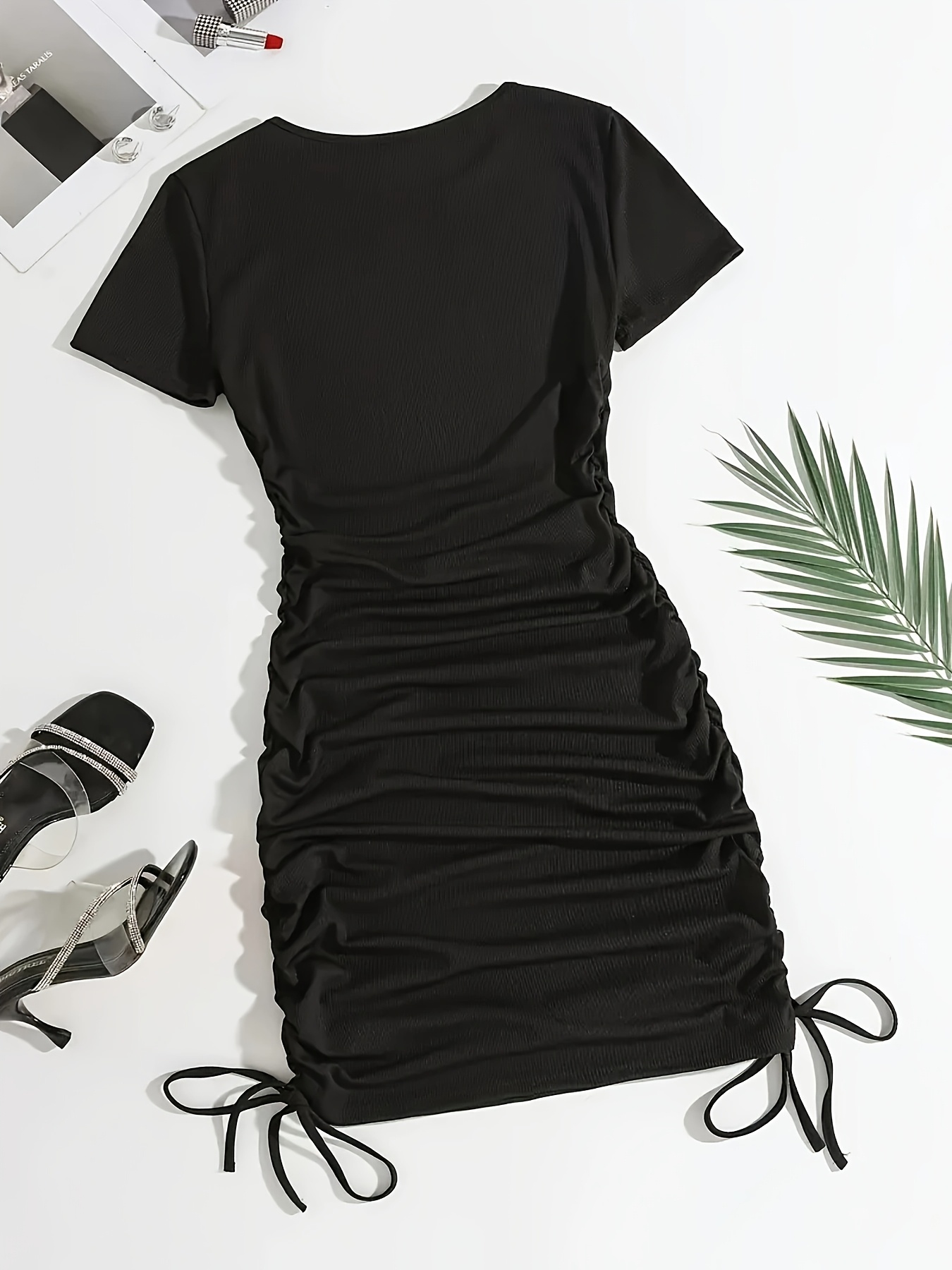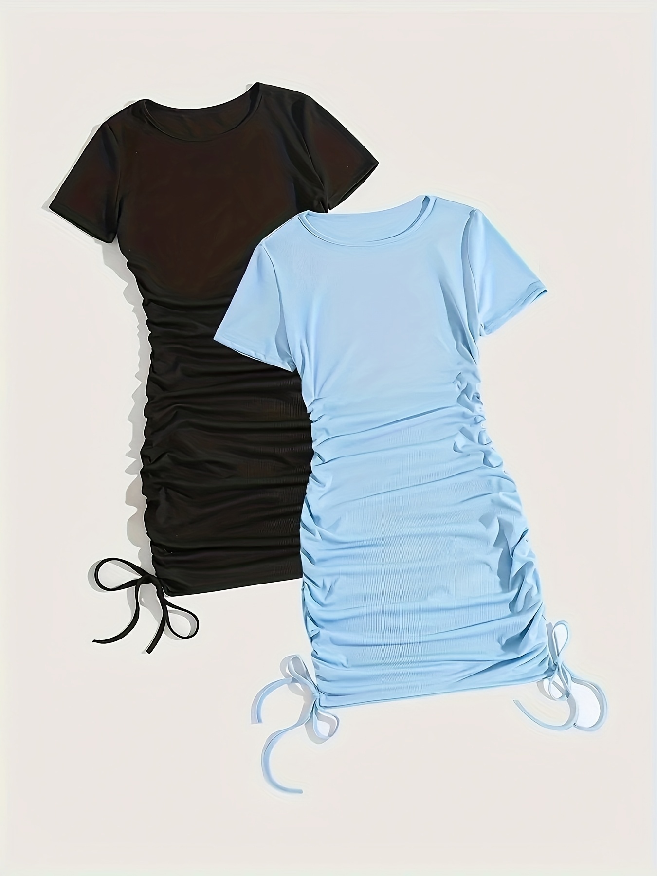 Women's 2pcs Set Summer Solid Color Striped Pleated Tie-Back Round Neck Short Sleeve Dress Special Edition
