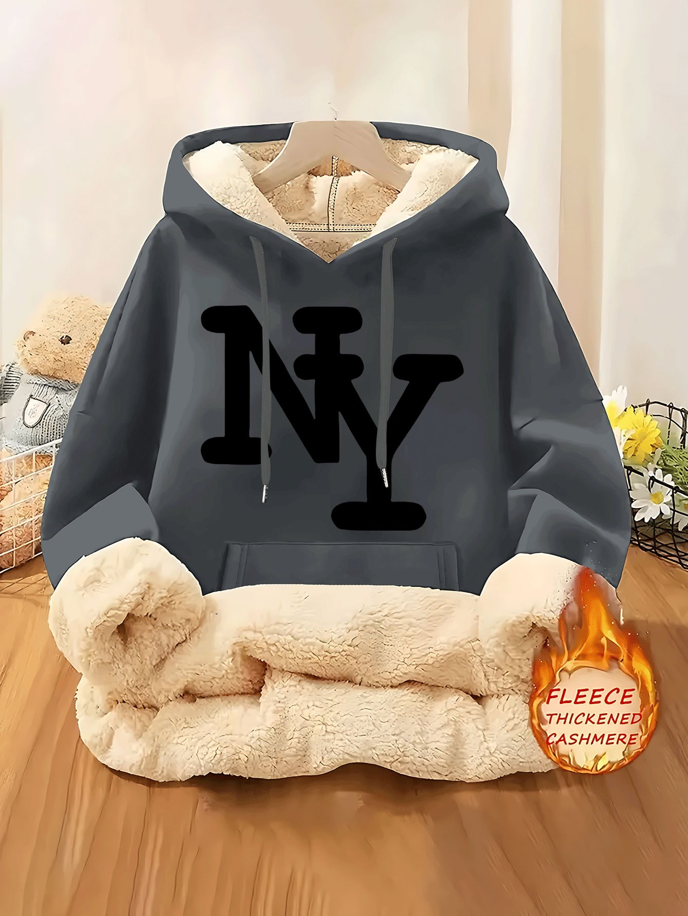 Women'S Cozy Fleece-Lined Hoodie with "NY" Letter Print - Thick Warm Polyester Pullover for Fall & Winter, Casual Long Sleeve Hooded Sweatshirt with Drawstring, Beige, All-Season Comfort Wear, Winter Hoodie