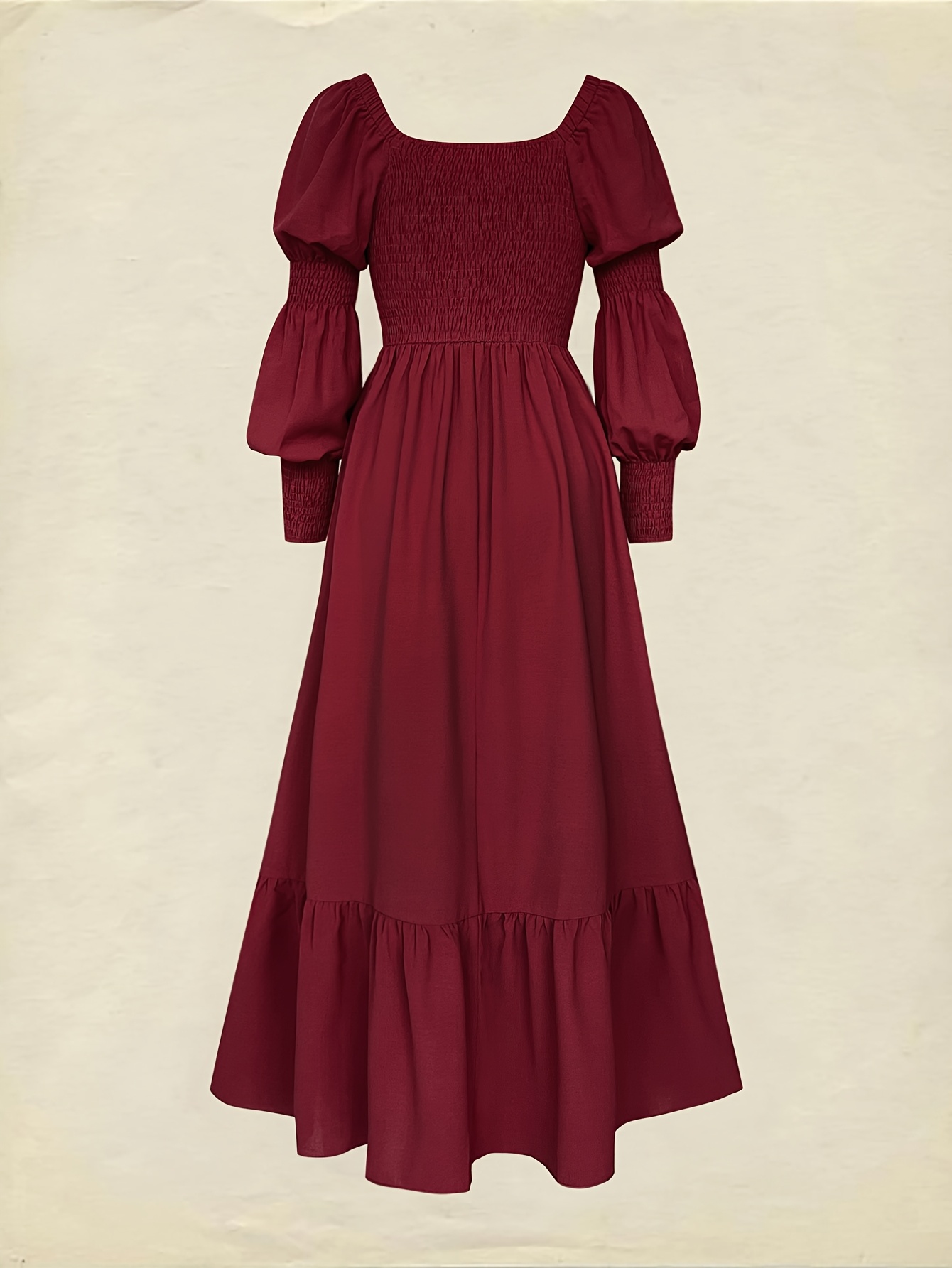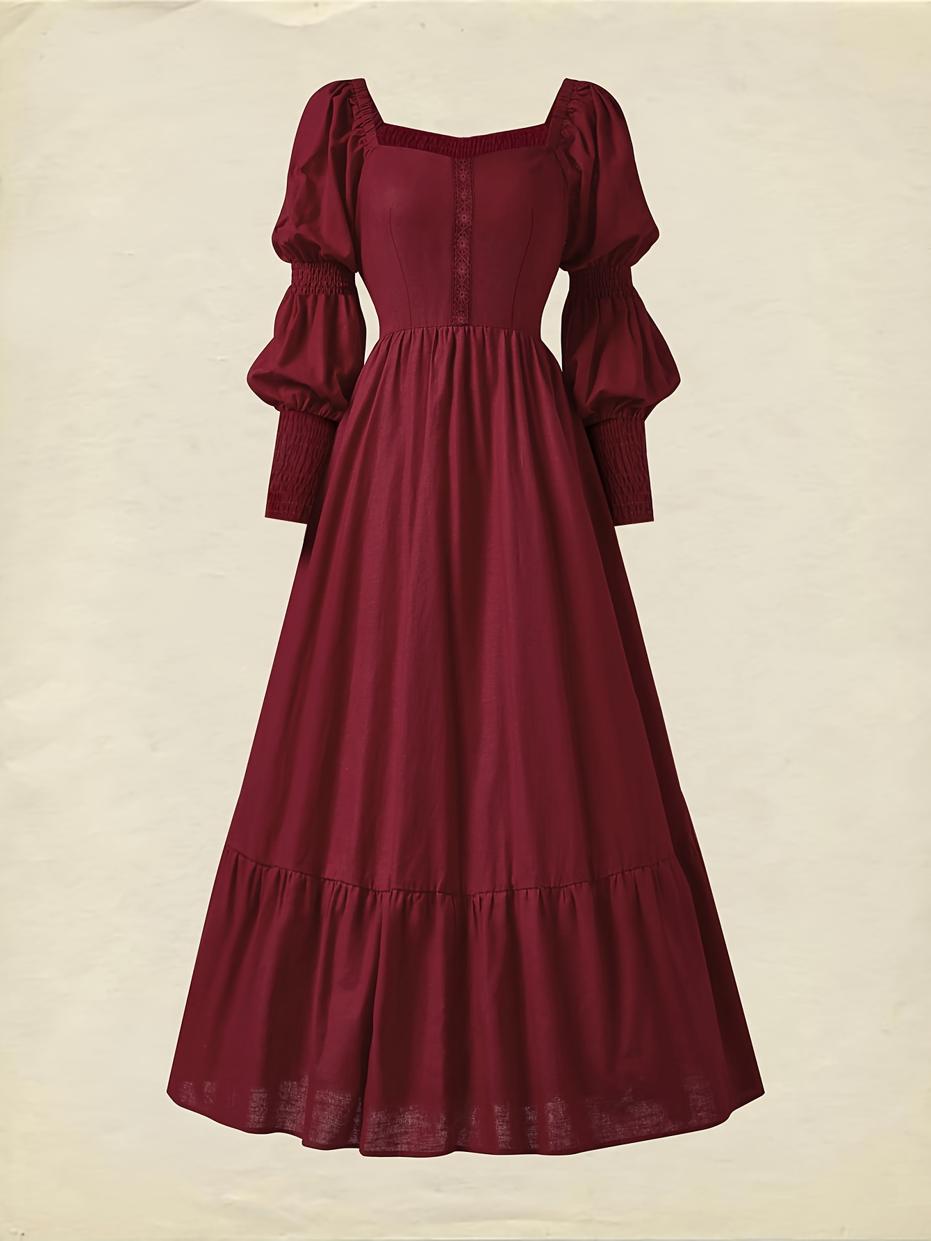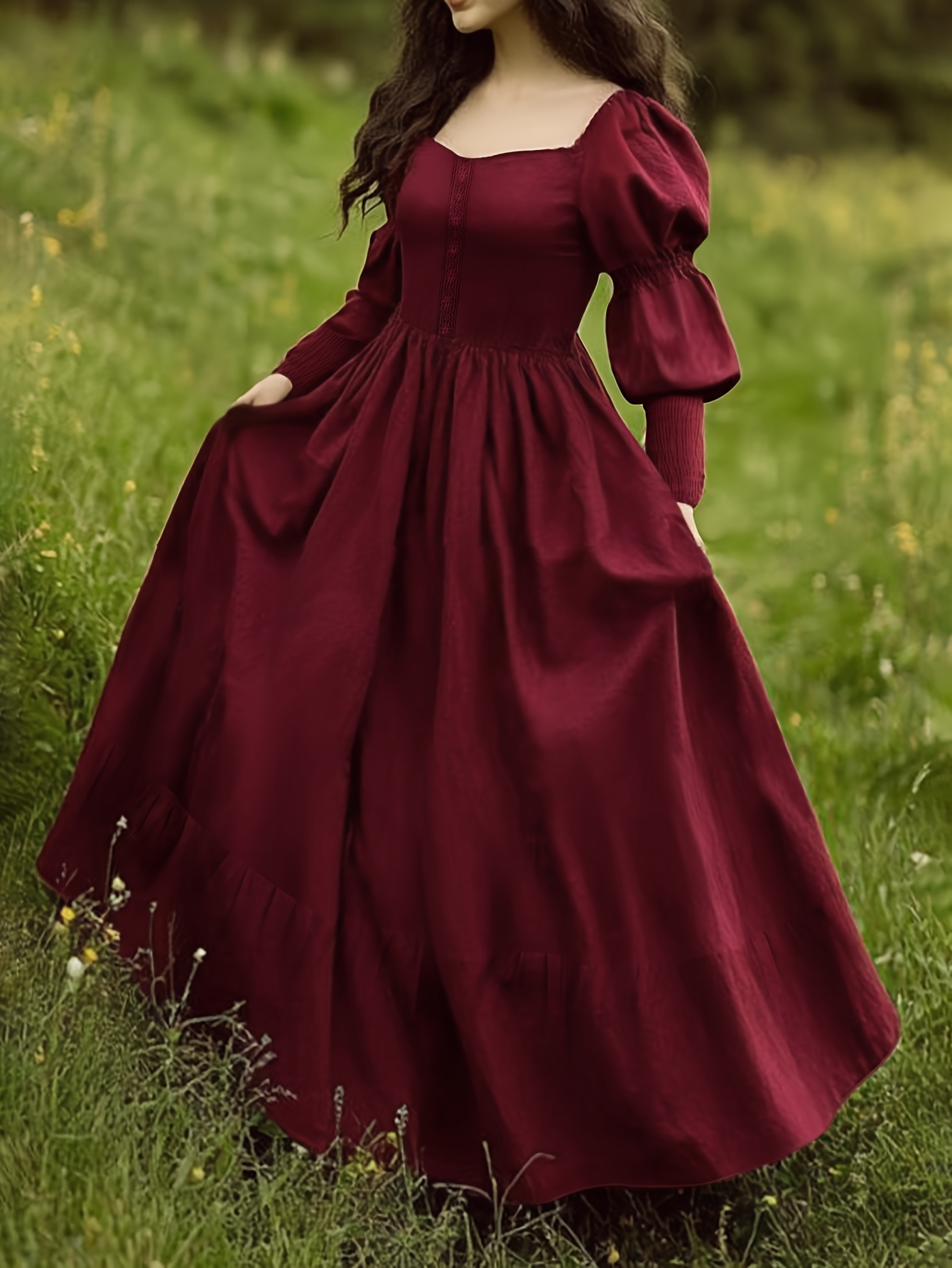 Women'S Elegant Burgundy A-Line Maxi Dress with Puffed Sleeve & Square Neck - Solid Color Floor-Length Formal & Semi-Formal Evening Gown, Machine Washable For Spring Summer Fall Events, Dresses For Wedding Guest, Seasonal Fashion, Sophisticated Styl