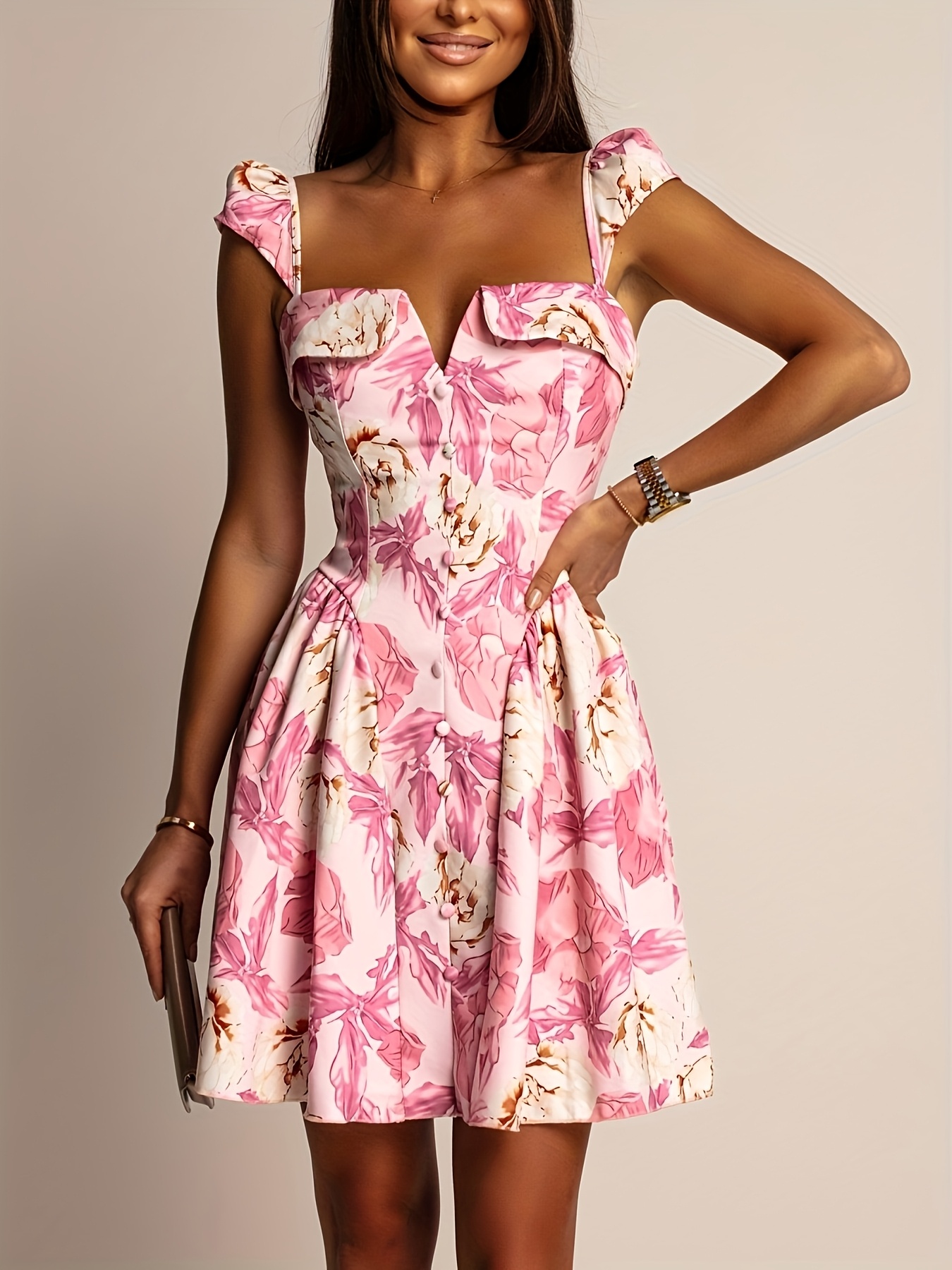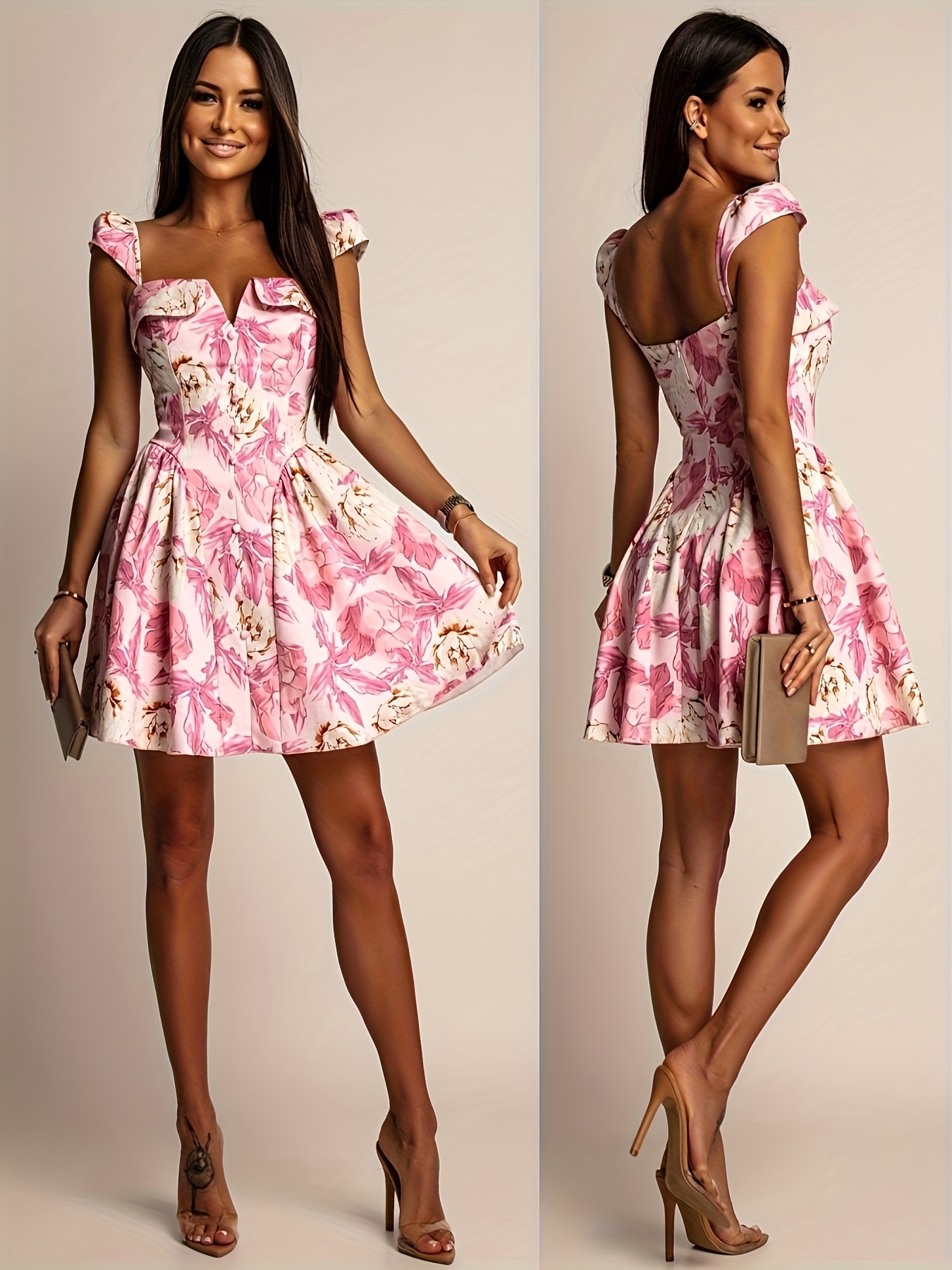 Women's Elegant Floral Dress - Square Neck flared skirt, Pink Floral Print, for Party, Date, Wedding - Women's Formal & Casual Outfits