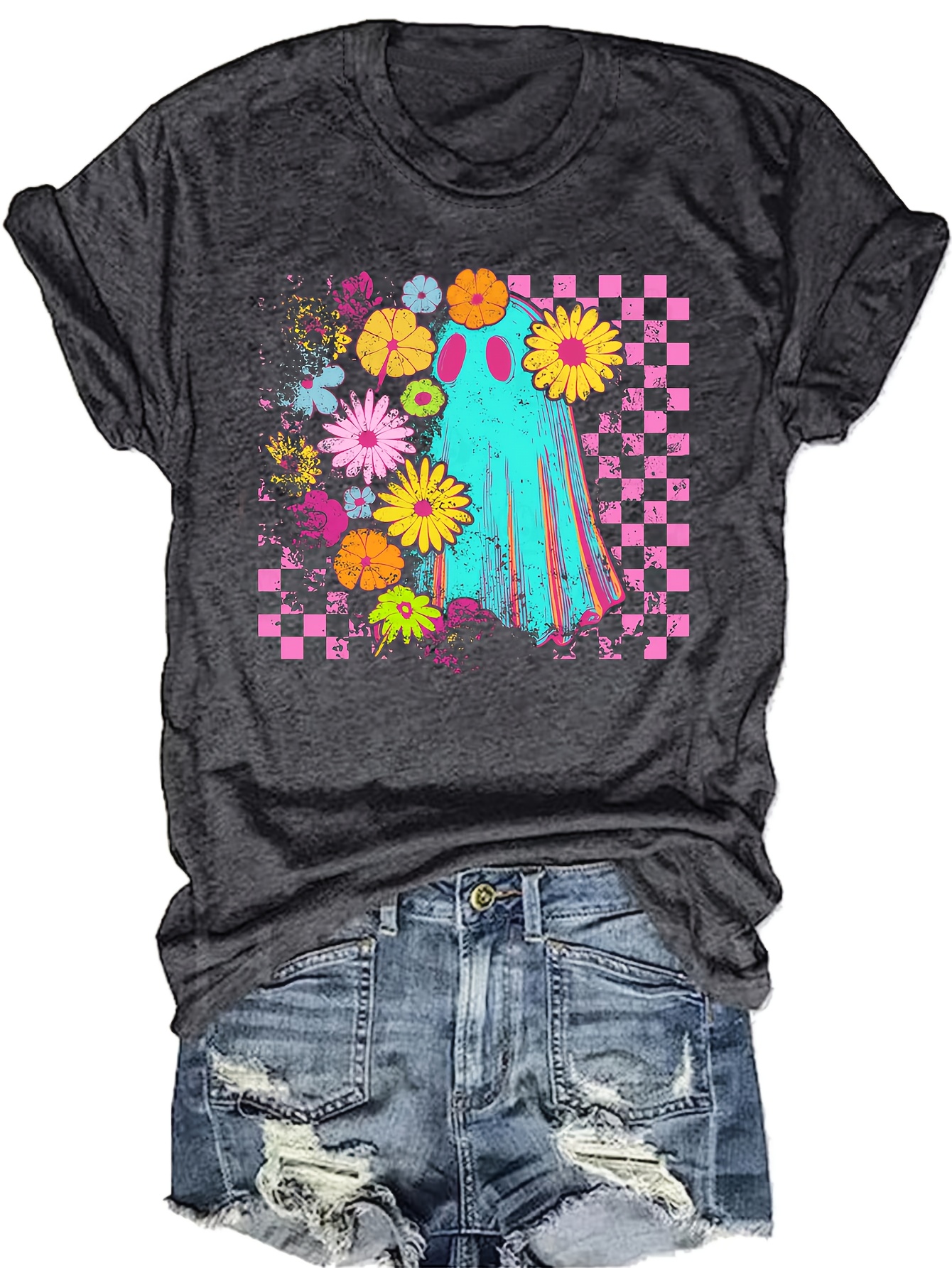 Women'S Halloween Graphic T-Shirt - Spooky Floral Print with Pink Checkered Background, Casual Short Sleeve Round Neck Tee for Casual Attire & Halloween Parties, Halloween Clothes, Festive Party Attire, Vibrant Print Top, Relaxed Fit Shirt
