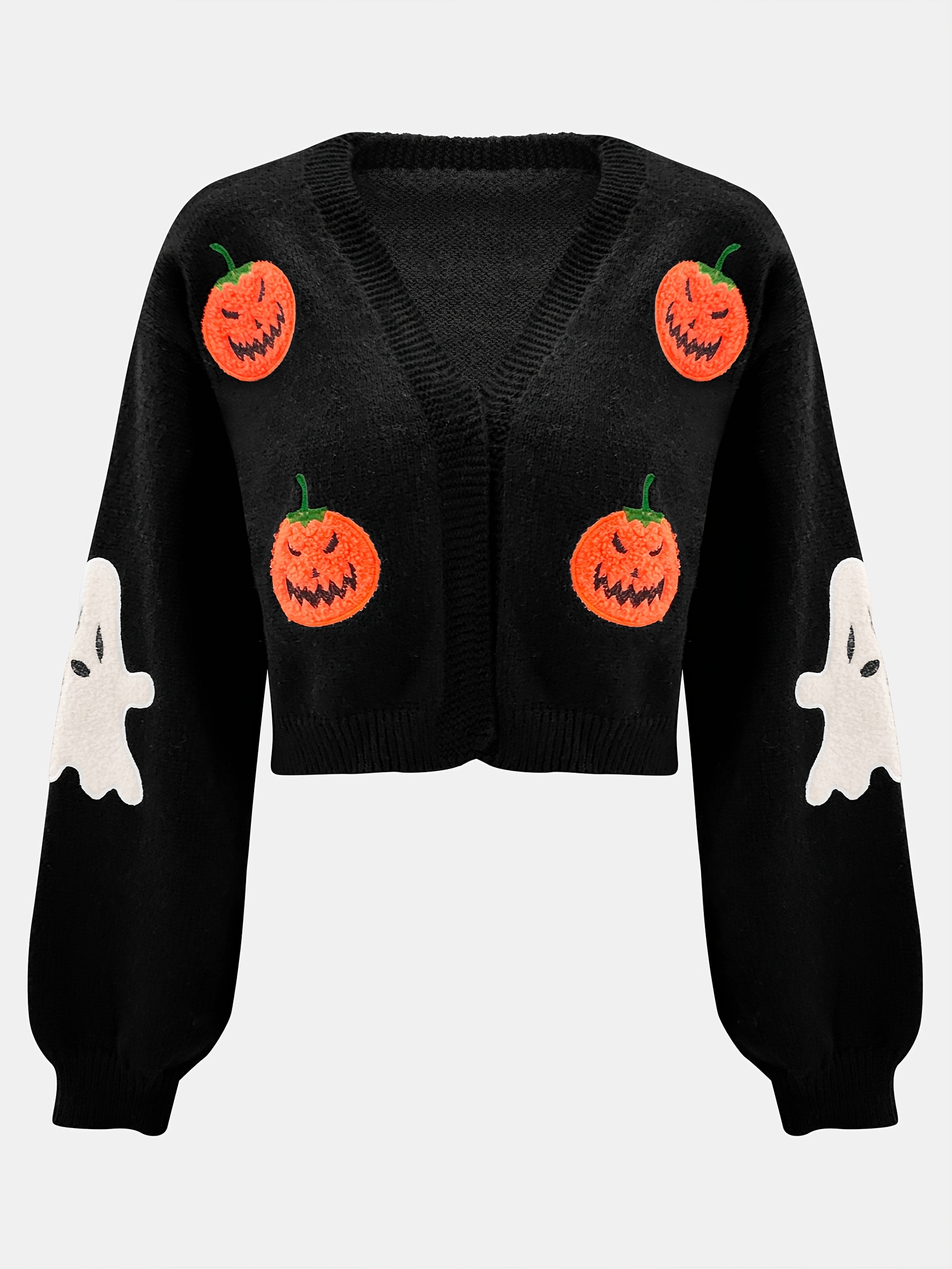 Women's Halloween Sweater - Black with Orange Pumpkin Patterns, Open Front Closure Cardigan, Non-Transparent Fall Winter Party Outfit, Elegant Halloween Party Jacket for Women, Halloween Clothes, Festive Attire, Medium Elasticity