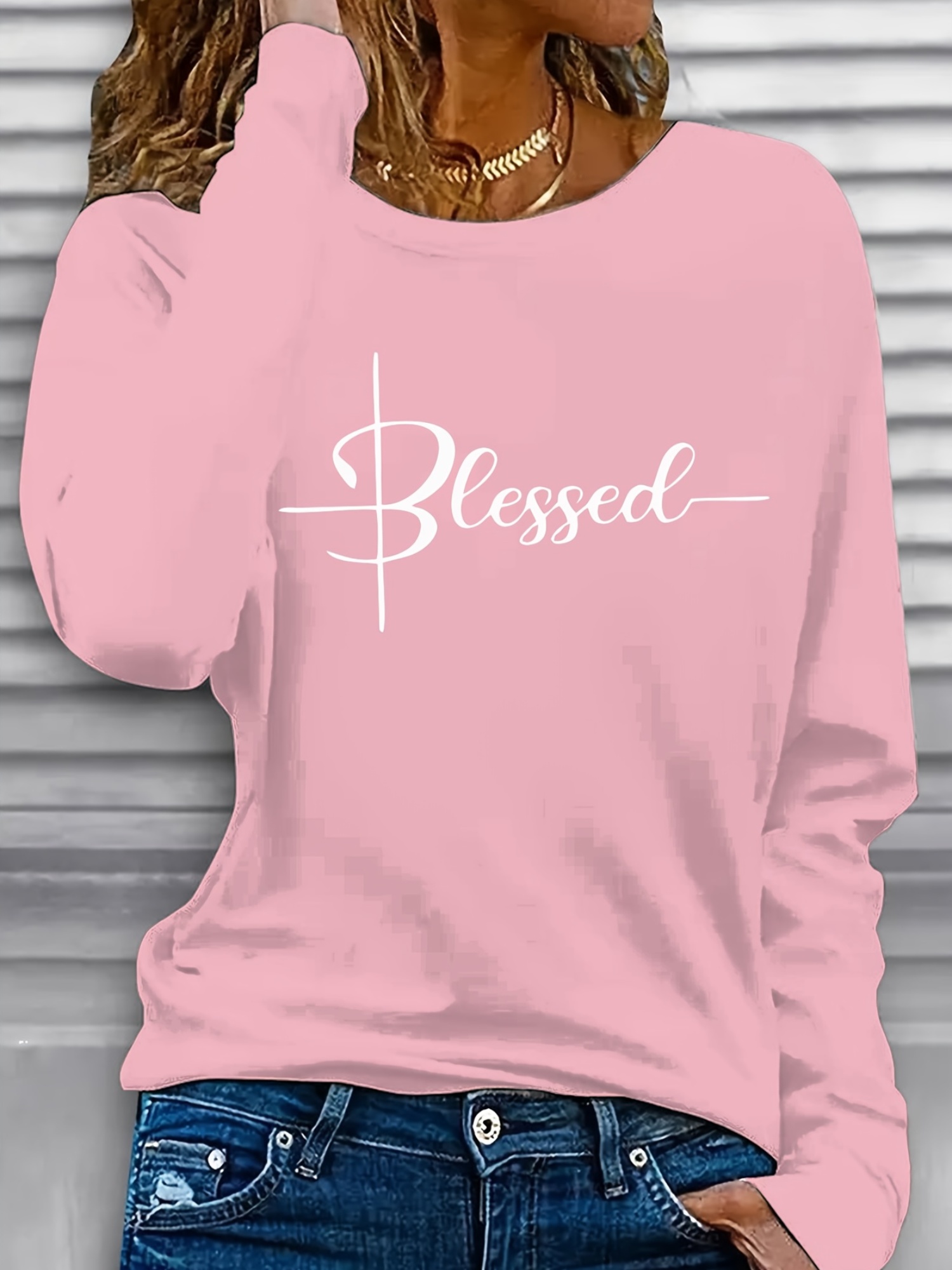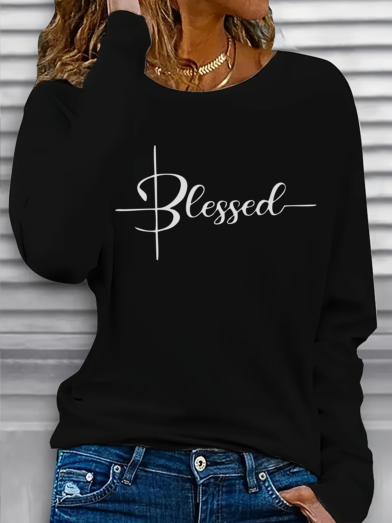 Women'S Long Sleeve T-Shirt - Blessed Script Lettering Top, Soft Everyday Casual Shirt for Everyday & Formal Outfits, All-Season Layering Essential Basic Tops for Women, Versatile Clothing, Classic Round Neckline, Durable Fabric