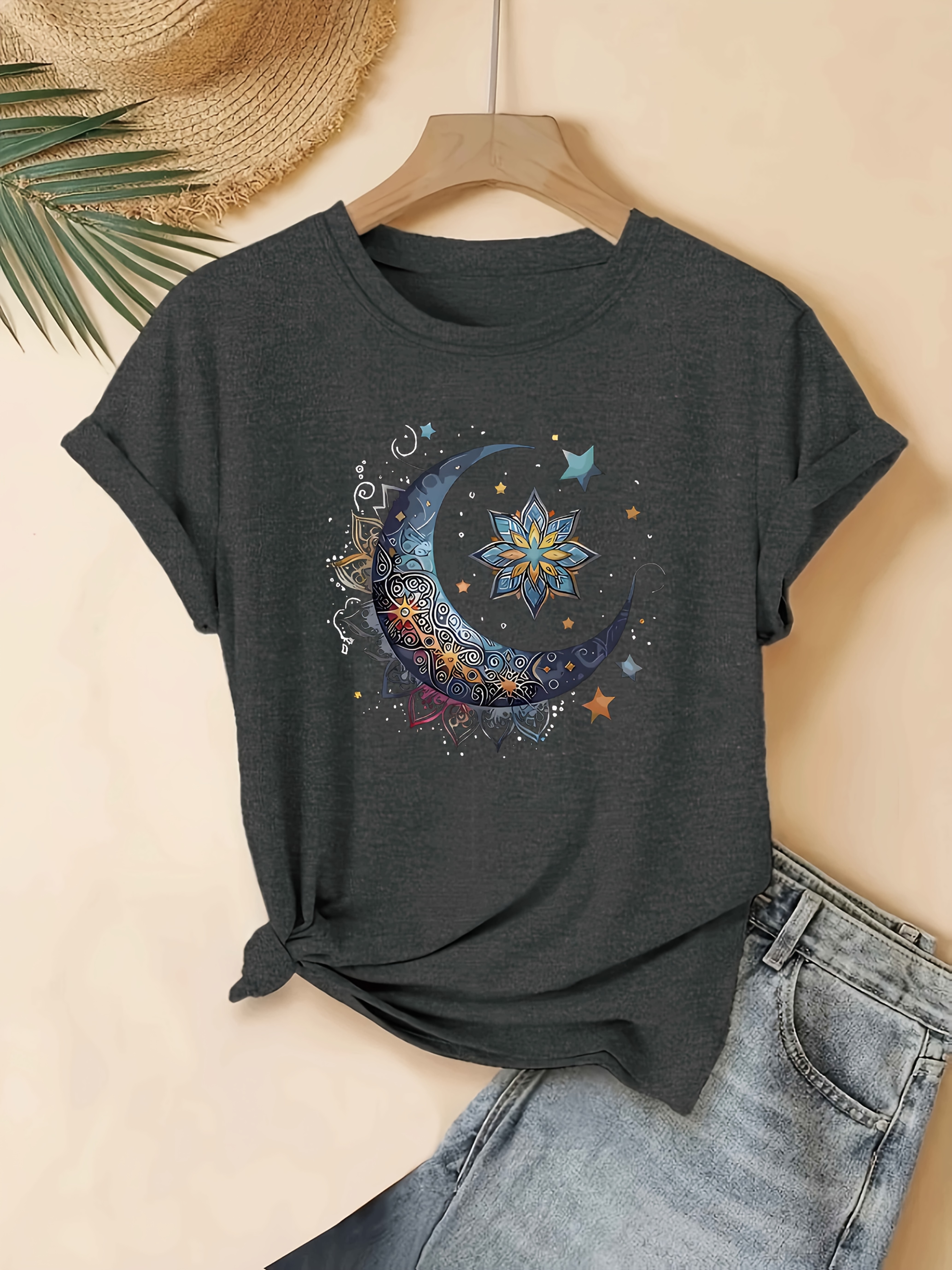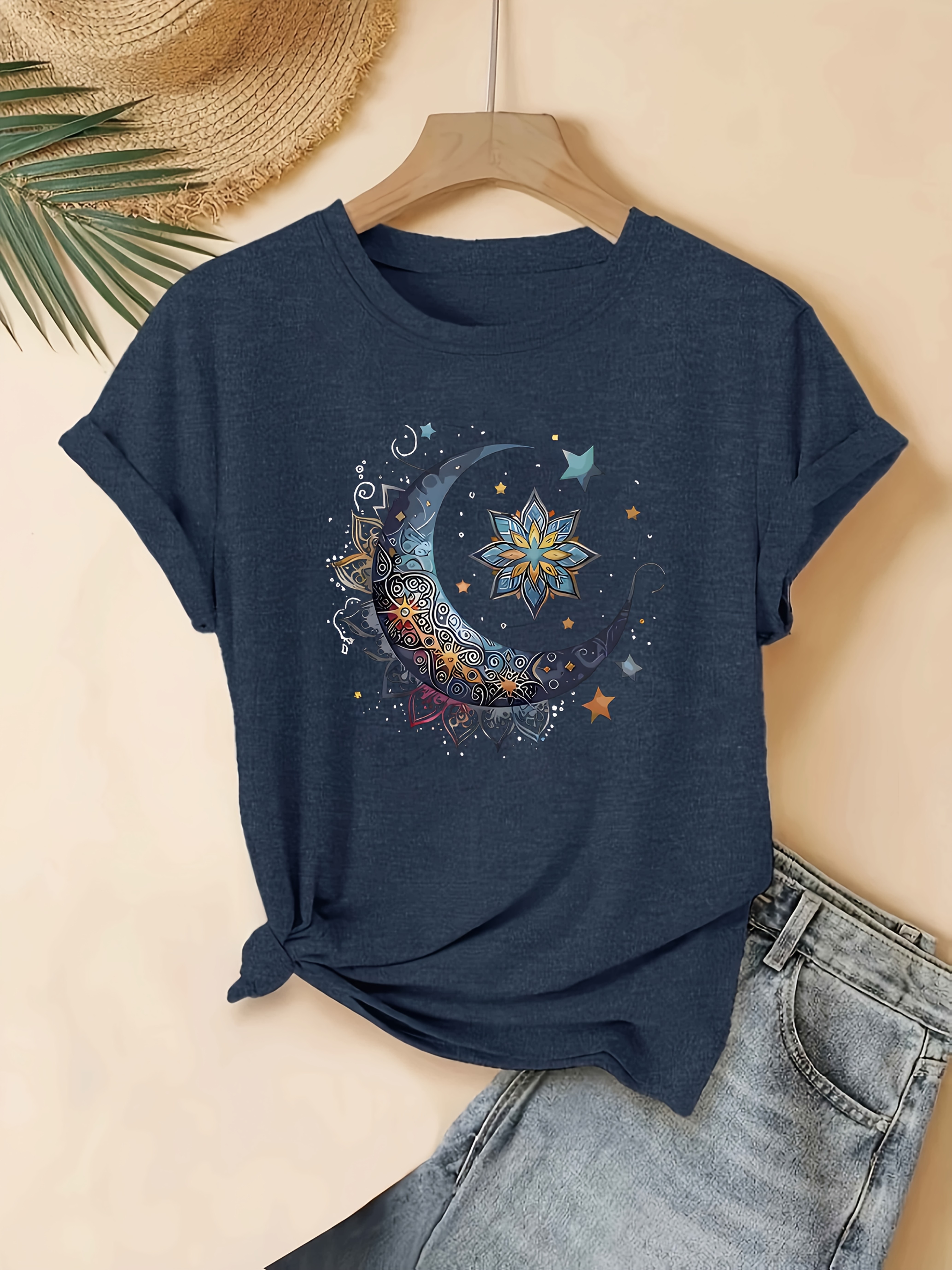 Women's Casual Short Sleeve Crew Neck T-Shirt - Vibrant Sun Moon Stars Paisley Print, Breathable Regular Fit Top for Spring Summer Fall, Machine Washable, Seasonal Fashion, Artistic Celestial Design, Comfortable Fabric