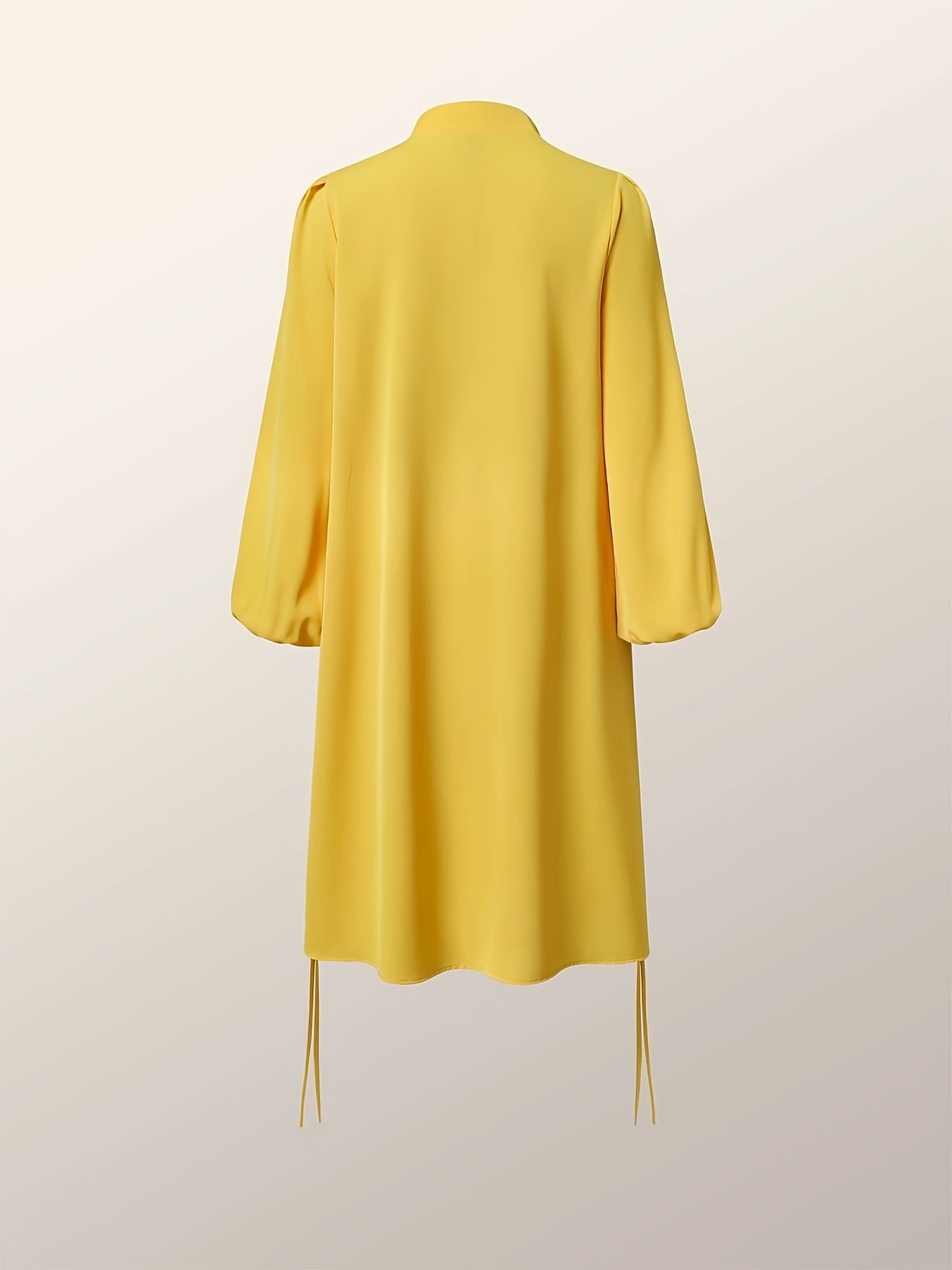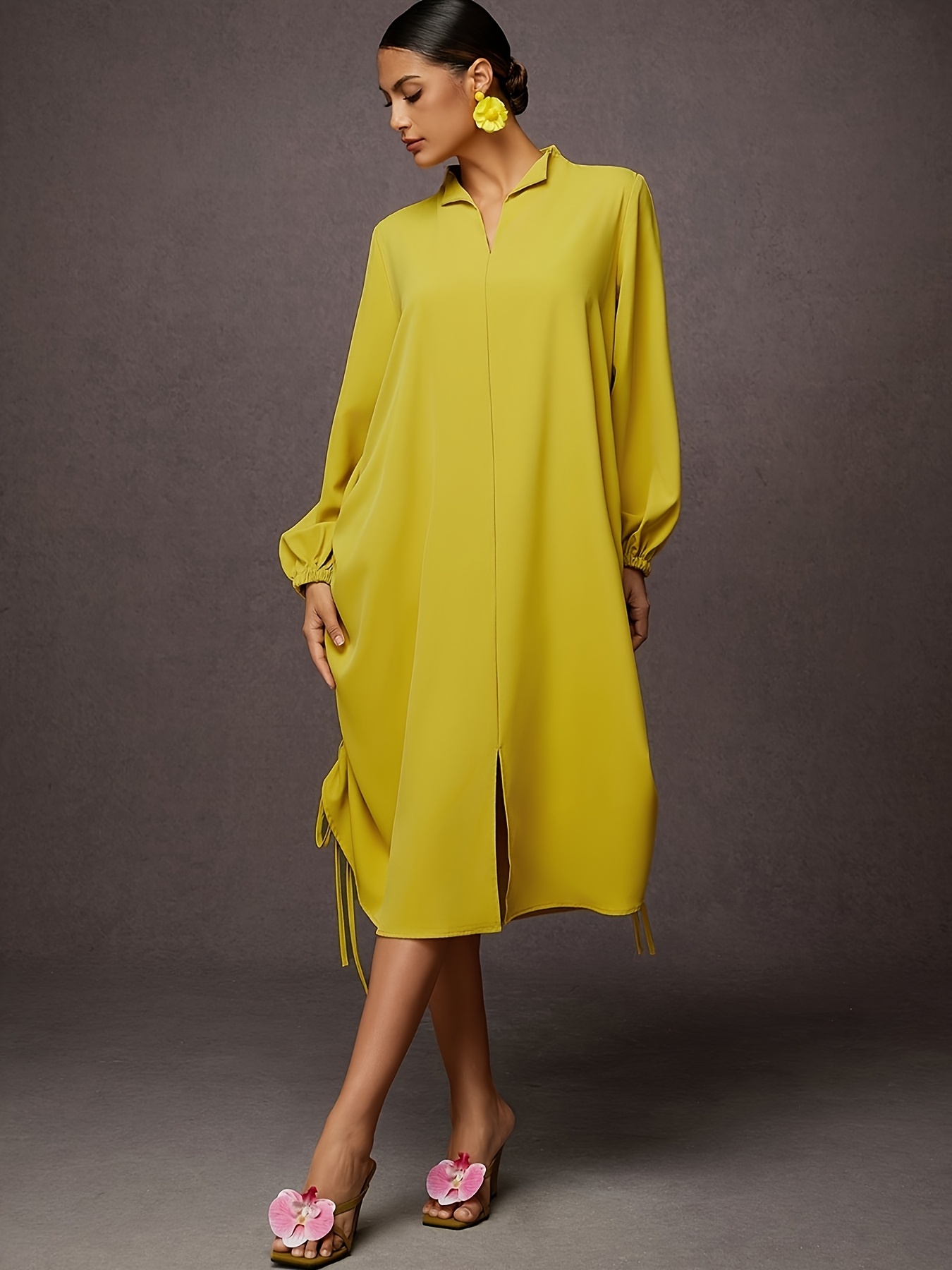 Women's Elegant Mustard-Yellow Loose-Fit Shirt Dress with Stand-Up Collar & Lantern Sleeves - Adjustable Drawstring Waist, Long Sleeves, Machine Washable, Spring/Summer/Fall Casual to Semi-Formal Wear, Flowy Fabric Gown