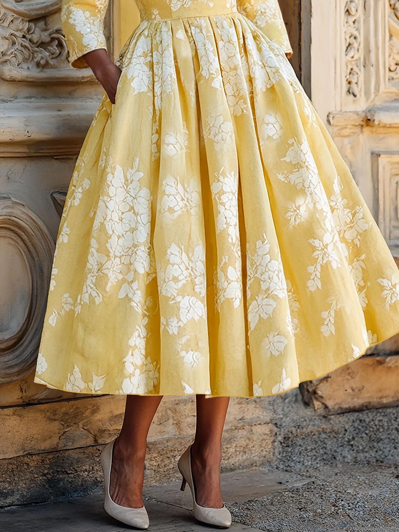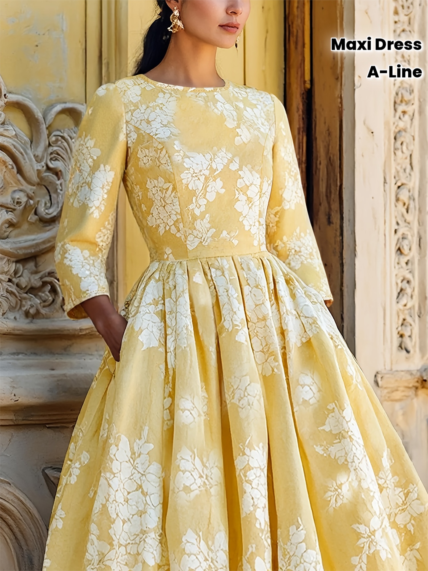 Women's Elegant Maxi Dress - Mustard-Yellow Floral print A-Line long dress, Non-Stretchy fabric for Formal & Casual Events, Office, Parties - All-Season Women's Clothing