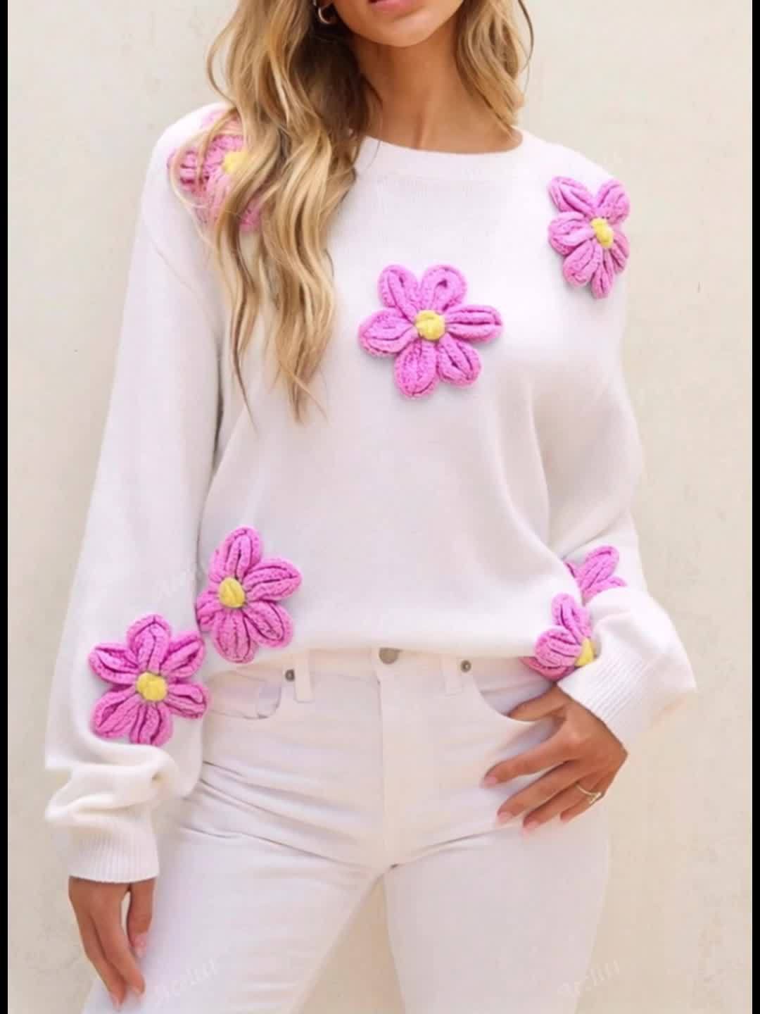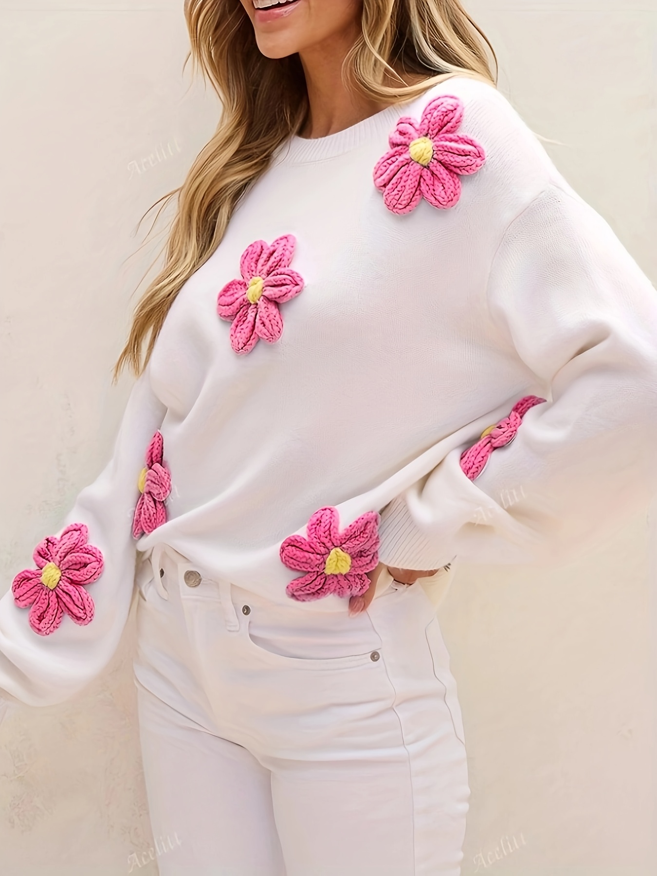 [Elegant Sweater] Valentine's Day Elegant Long Sleeve Crew Neck Sweater | Solid Color, Cute Flower Decorations, Women's Fashion - All Seasons